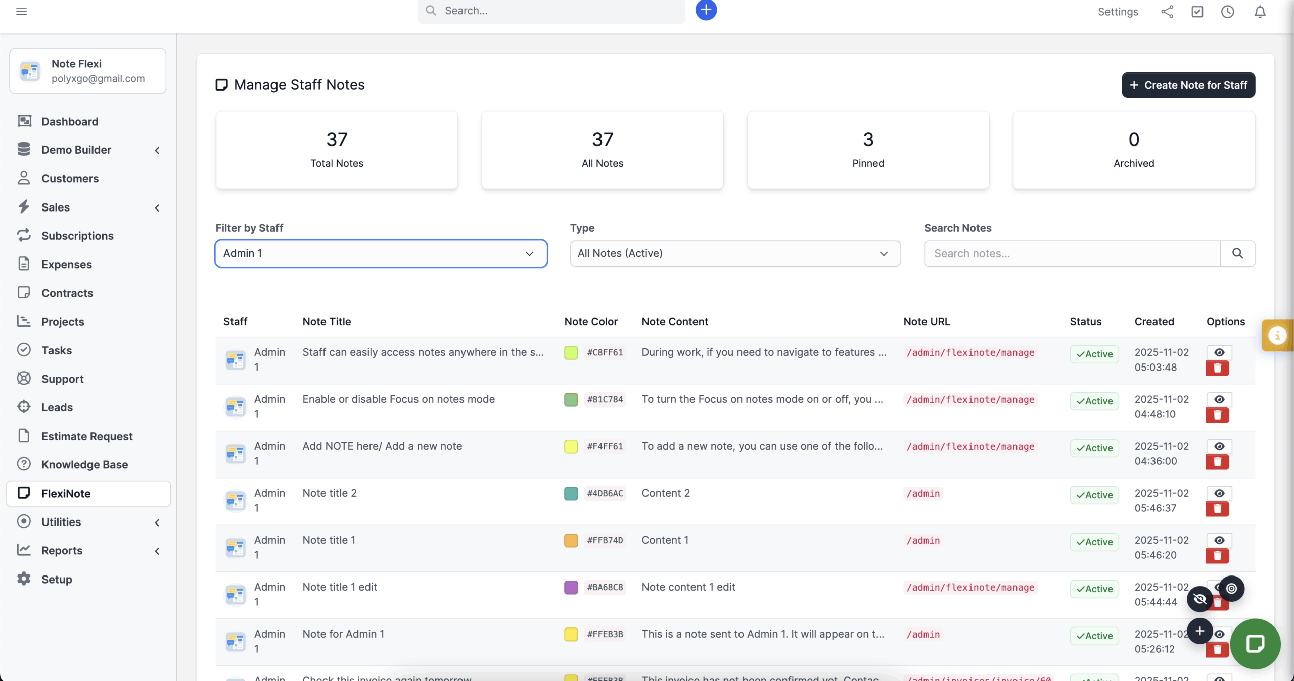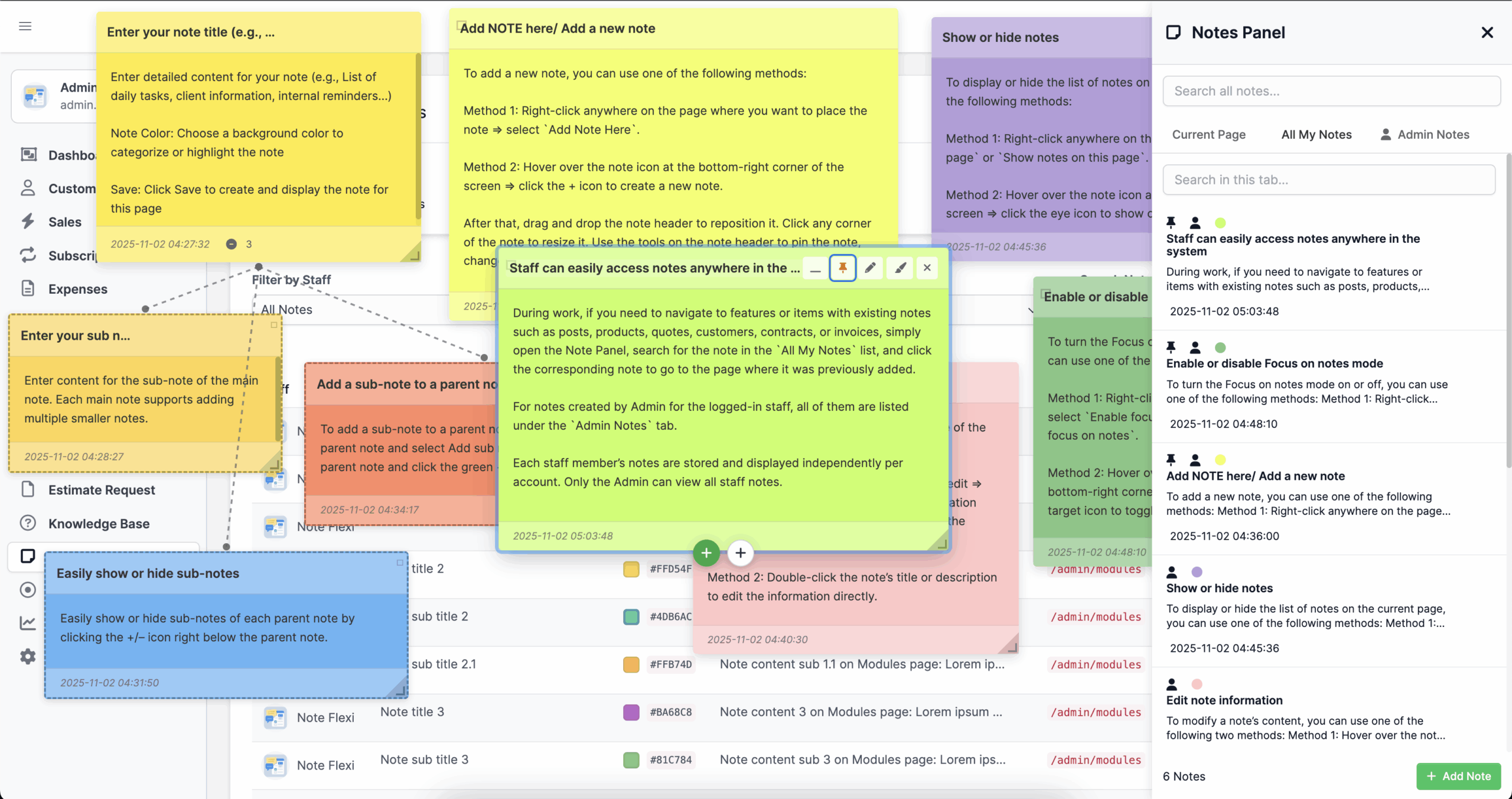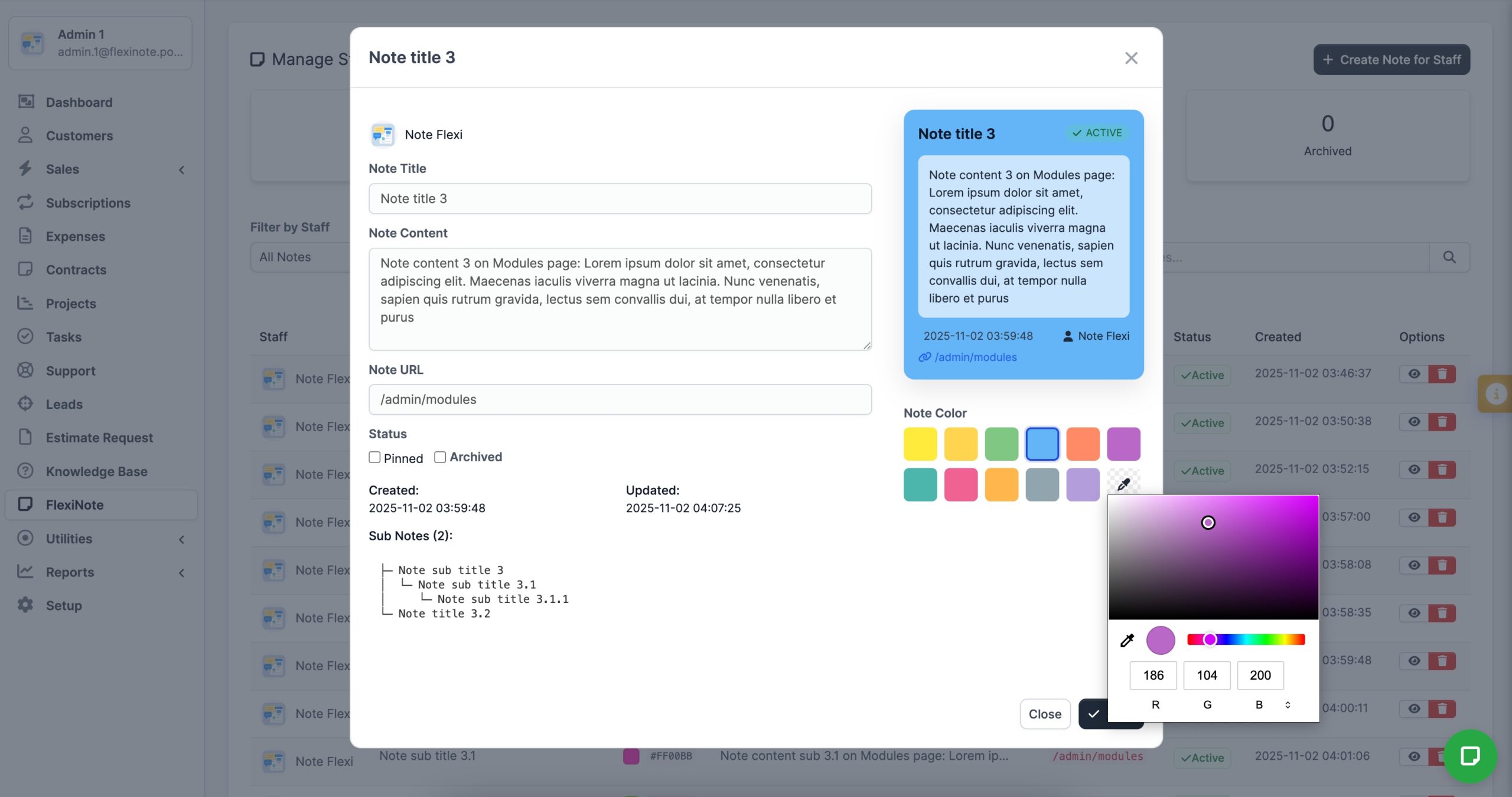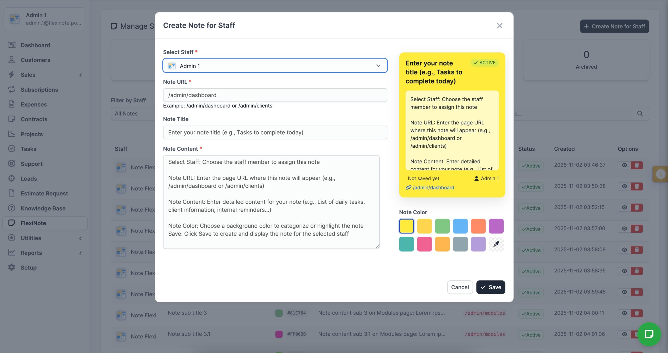 FlexiNote for Perfex CRM extends note-taking capability inside Perfex CRM. Staff can create and manage personal notes instantly from any admin page. Notes attach to pages such as Projects, Orders, Tasks, Tickets, Invoices, Payments, Modules, or Settings, so critical information appears every time a new session starts. Workflow becomes faster, more consistent, and more efficient.